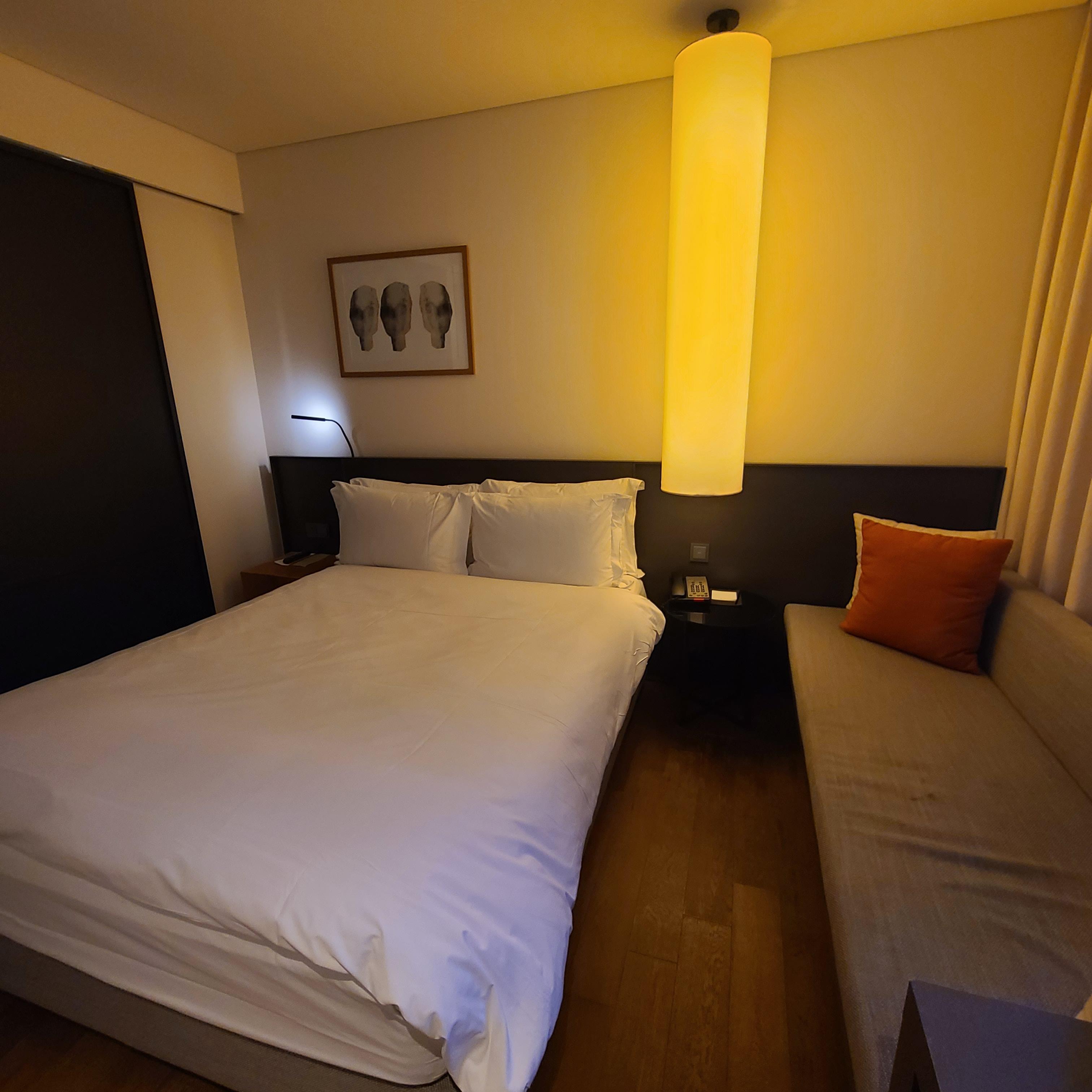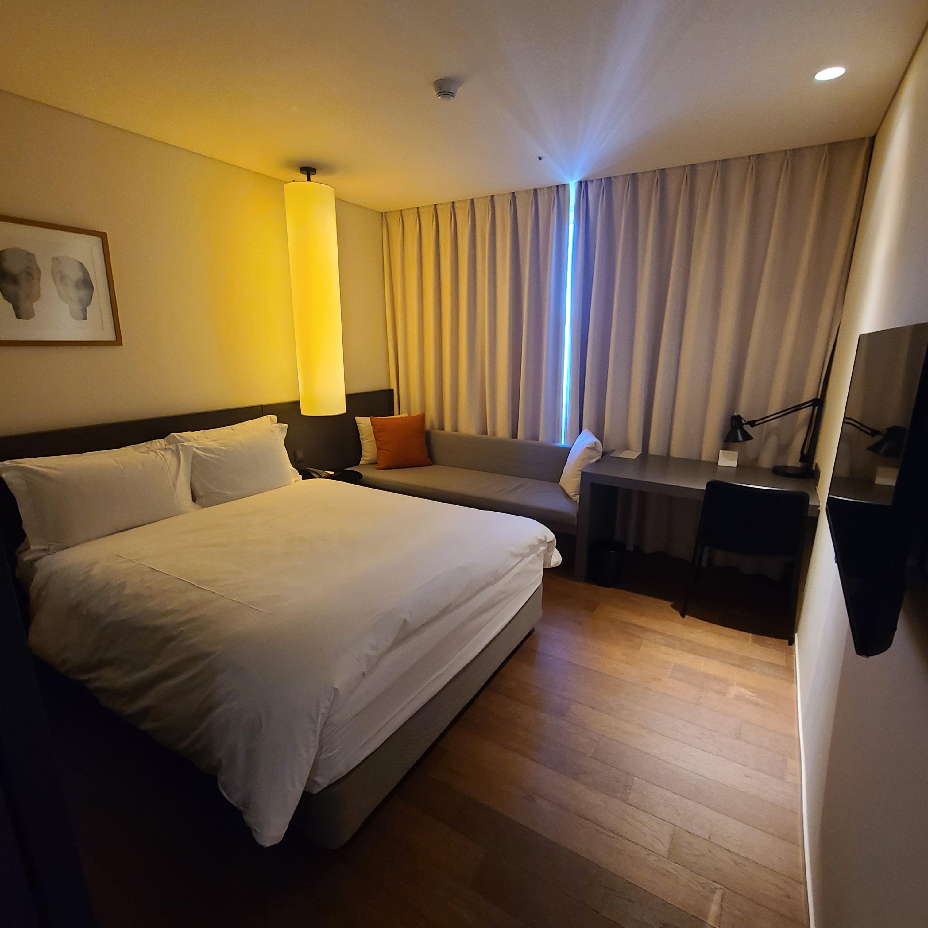 디럭스 더블룸은 더블베드와 소파&쿠션, 데스크로 구성되어있었어요. 처음 들들어갔을 때 따뜻한 조명이 켜져있어서 내가 하루동안 쉬러 왔구나~ 라는 느낌을 더욱 잘 받을 수 있었어요.