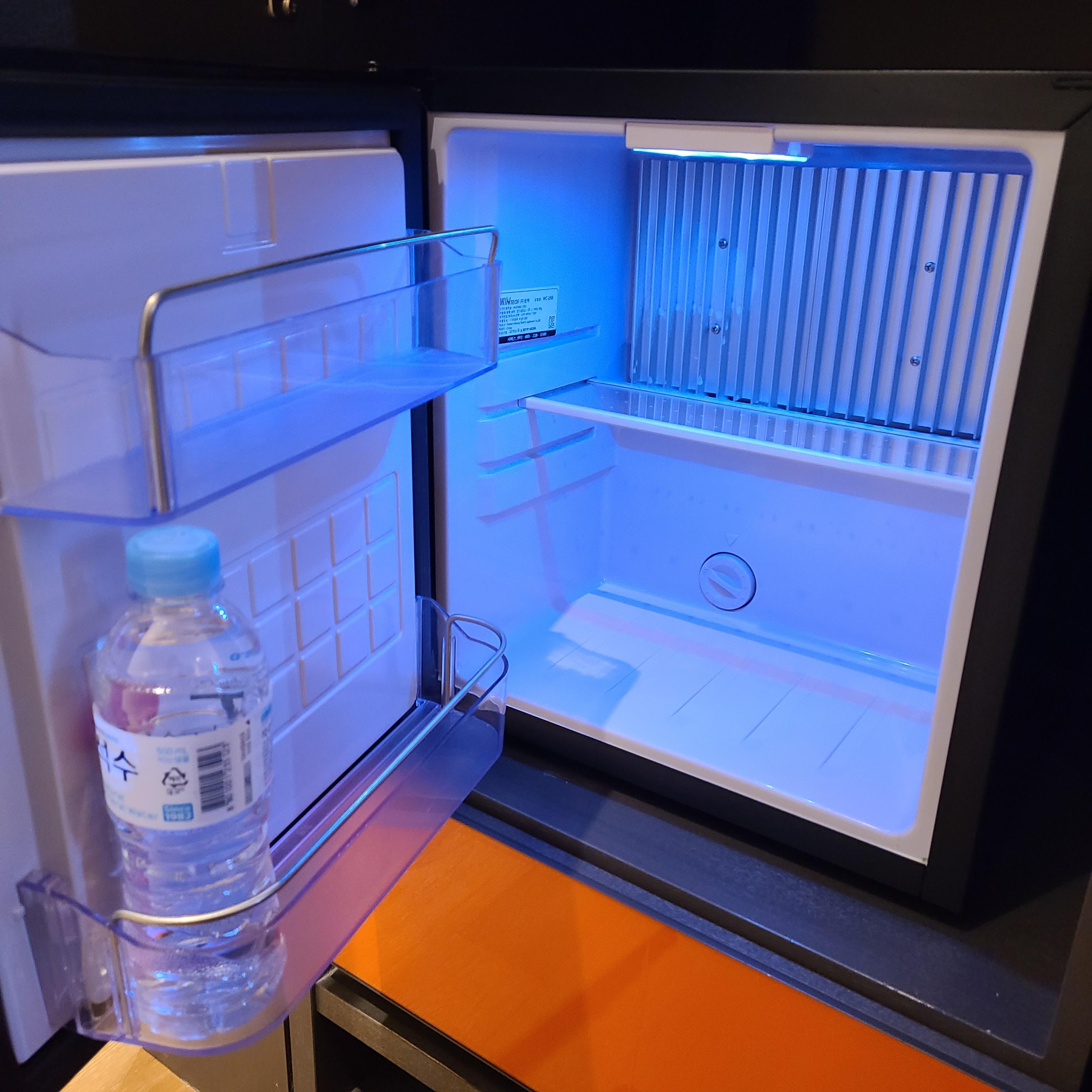 티백 하단에는 냉장고가 있었고, 꽤나 넓은 공간이있어서 배달음식이나 간단히 홈파티 음식을 사와서 보관하기에도 부족함없는 크기였어요. 냉장고 하단에는 물품 보관 금고가 같이있어서 귀중품 보관하기도 좋았습니다.