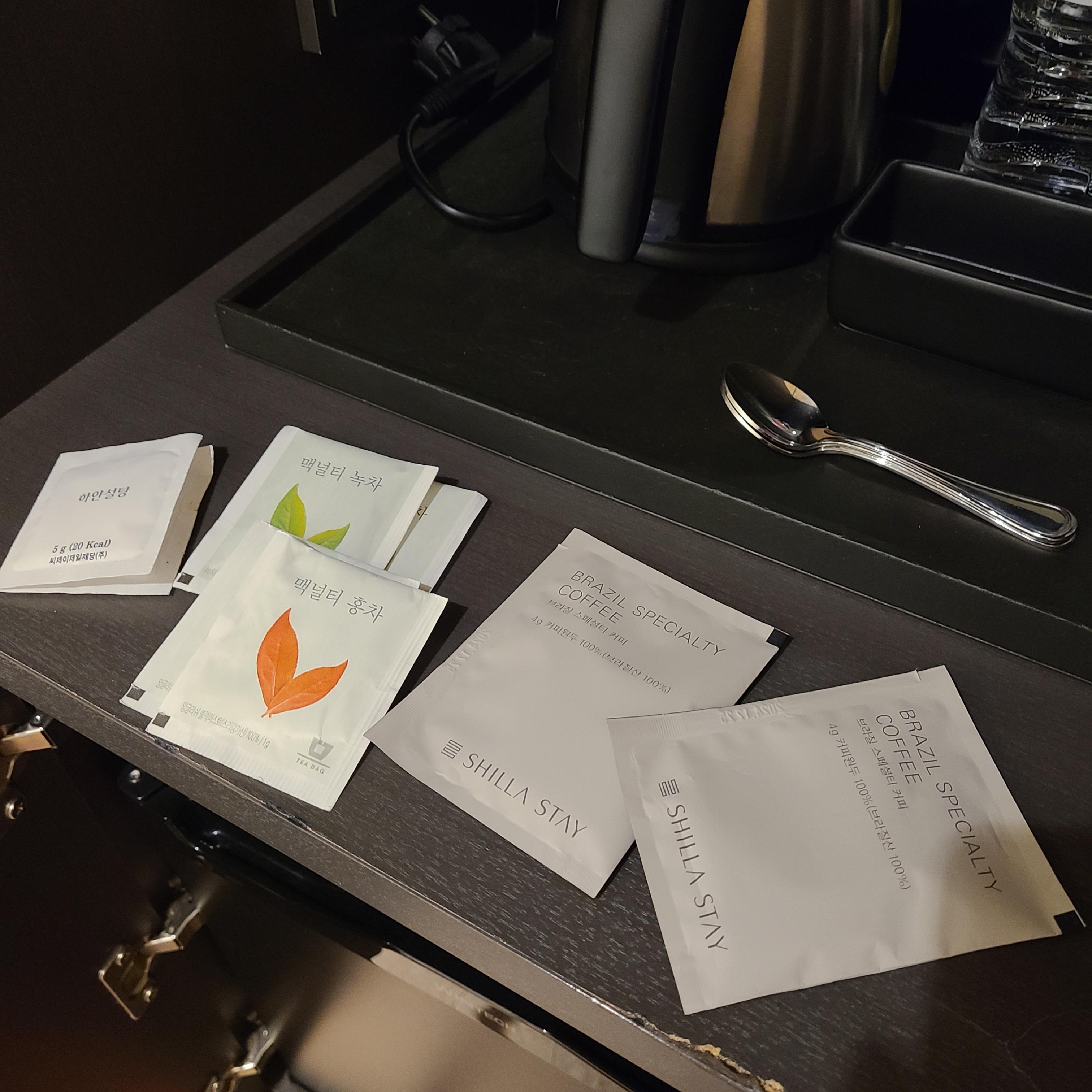 안쪽에는 커피포트와 티백들이 마련되어있었는데요. 녹차, 홍차, 커피 3가지가 준비 되어있어서 기호에 맞게 골라 먹을 수 있었어요. 아메리카노를 못먹는 사람들을 위해서 설탕까지 준비된 센스도 있었습니다.